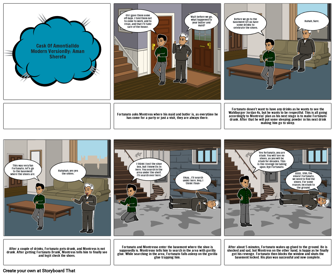 After about 5 minutes, Fortunato wakes up glued to the ground. He is shocked and sad, but Montress on the other hand, is happy as he finally got his revenge. Fortunato then blocks the window and shuts the basement locked. His plan was successful and now complete.