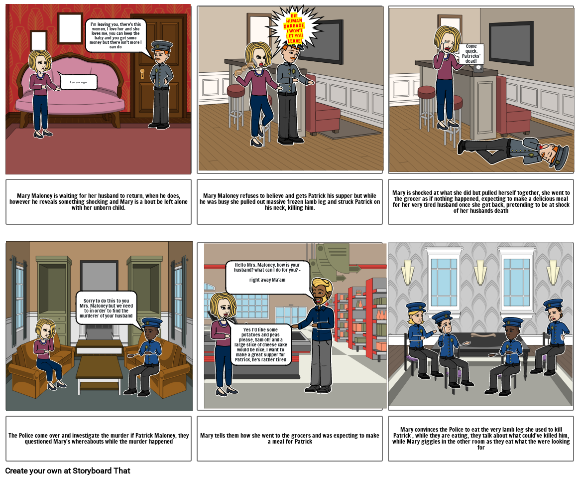 Mary Maloney refuses to believe and gets Patrick his supper but while he was busy she pulled out massive frozen lamb leg and struck Patrick on his neck, killing him.