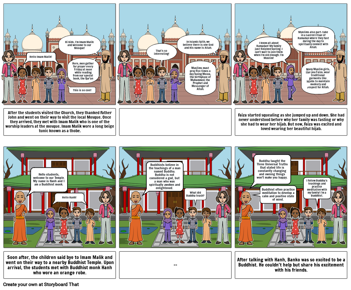 Soon after, the children said bye to Imam Malik and went on their way to a nearby Buddhist Temple. Upon arrival, the students met with Buddhist monk Hanh who wore an orange robe.