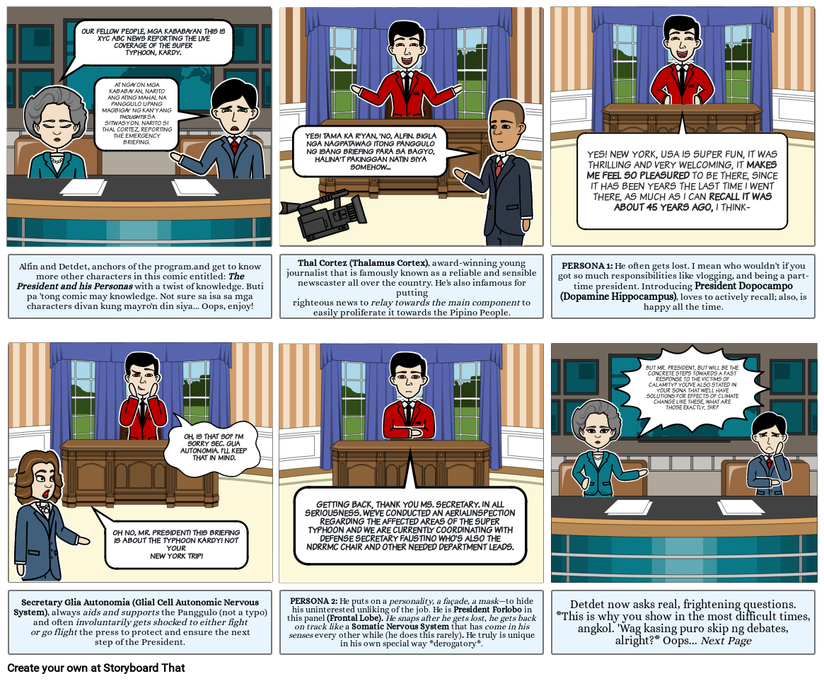 PERSONA 1: He often gets lost. I mean who wouldn't if you got so much responsibilities like vlogging, and being a part-time president. Introducing President Dopocampo (Dopamine Hippocampus), loves to actively recall; also, is happy all the time.