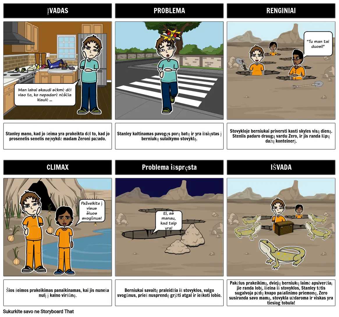 • Stanley kaltinamas pavogęs porą batų ir yra išsiųstas į berniukų sulaikymo stovyklą.