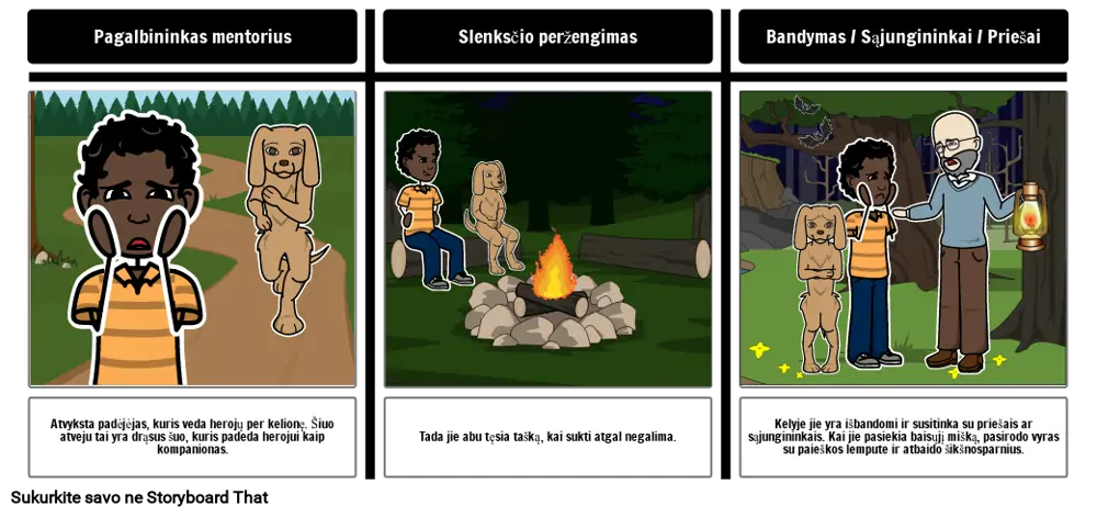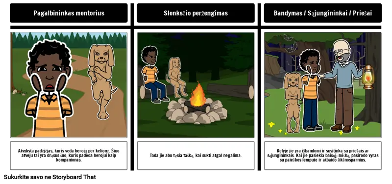 Atvyksta padėjėjas, kuris veda herojų per kelionę. Šiuo atveju tai yra drąsus šuo, kuris padeda herojui kaip kompanionas.