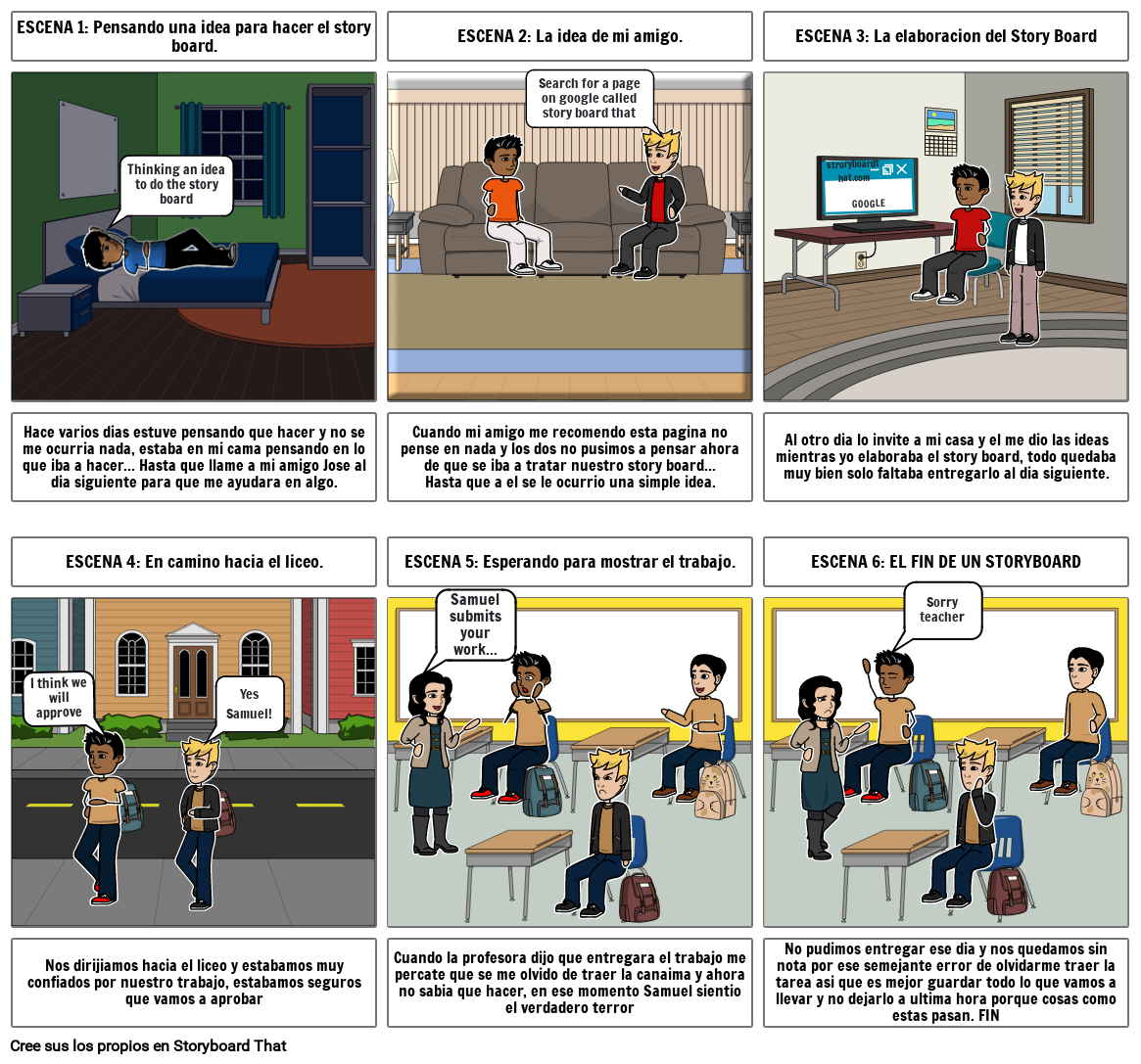 Al otro dia lo invite a mi casa y el me dio las ideas mientras yo elaboraba el story board, todo quedaba muy bien solo faltaba entregarlo al dia siguiente.