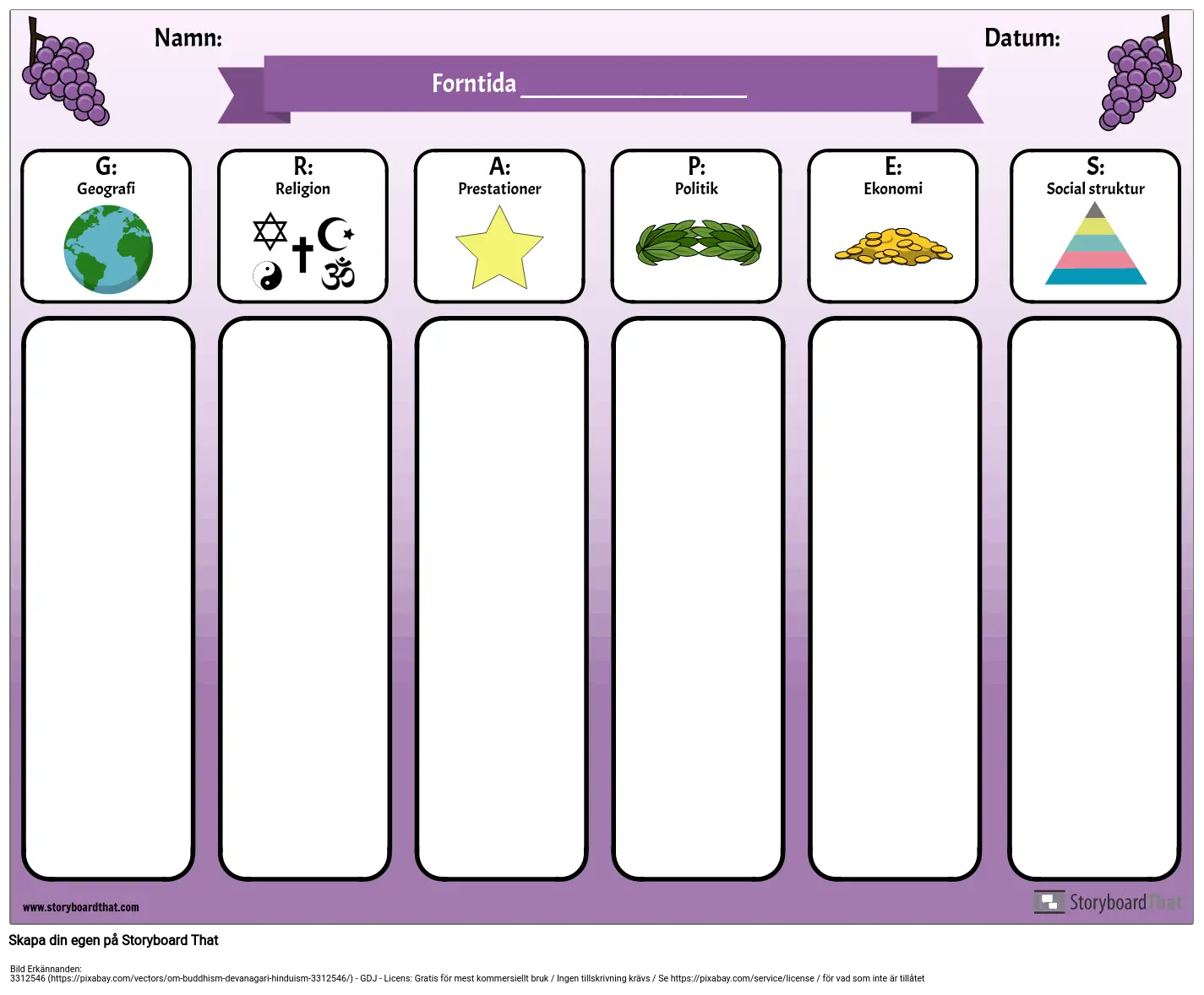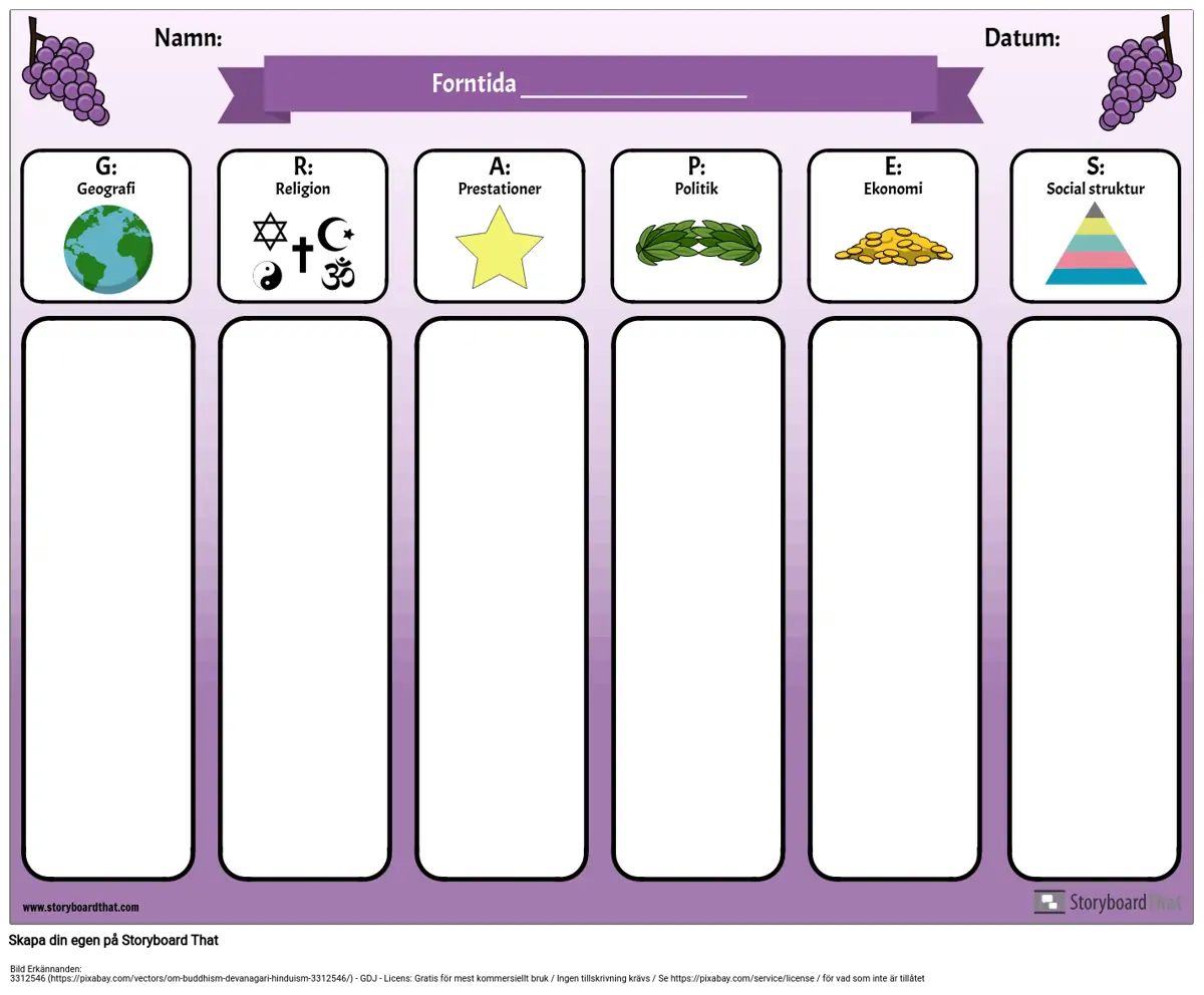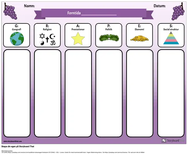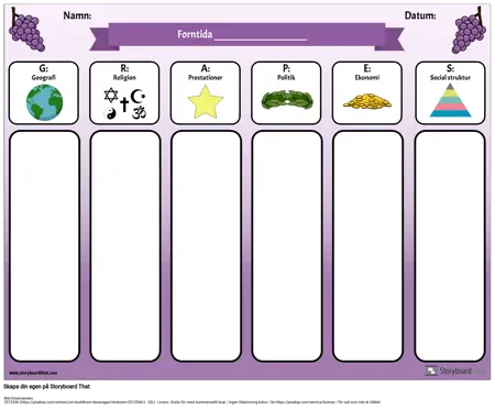 GRAPES-förkortningen är ett användbart verktyg när man studerar om forntida civilisationer eller olika länder. Använd detta GRAPES-diagram digitalt (låt eleverna skriva sina anteckningar och lägga till bilder i varje kategori) eller skriv ut det så kan eleverna skriva sina anteckningar.