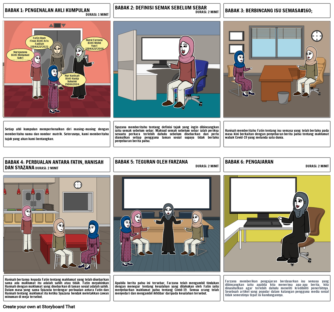 Hanisah bertanya kepada Fatin tentang maklumat yang telah disebarkan sama ada maklumat itu adalah sahih atau tidak. Fatin meyakinkan Hanisah dengan maklumat yang disebarkan di laman sosial adalah sahih. Dalam masa yang sama Syazana terdengar perbualan antara Fatin dan Hanisah tentang maklumat itu ketika Syazana hendak meletakkan cawan minuman di meja tersebut.