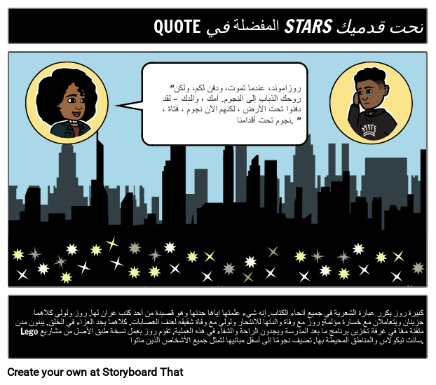 اطلب من الطلاب كتابة نص للاتصال الذاتي بـ The Stars Beneath Our Feet باختيار اقتباسهم أو مشهدهم المفضل وتوضيح ما يعنيه لهم.