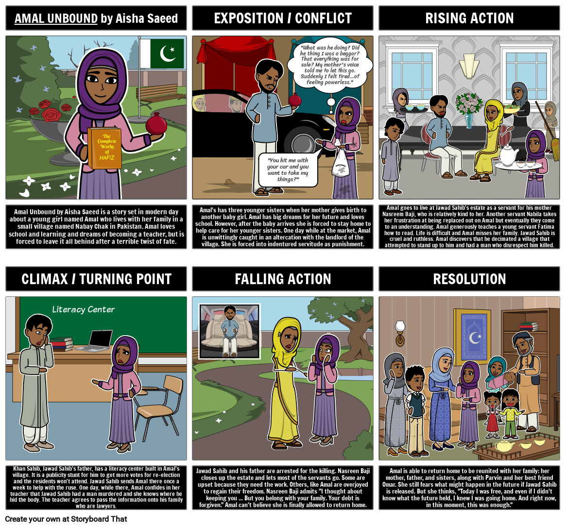 يمكن للطلاب تلخيص وتوضيح حبكة القصة في لوحة القصة المكونة من 6 خلايا والتي تسلط الضوء على العرض والصراع ، والعمل المتصاعد ، والذروة / نقطة التحول ، والحركة المتساقطة ، والقرار.