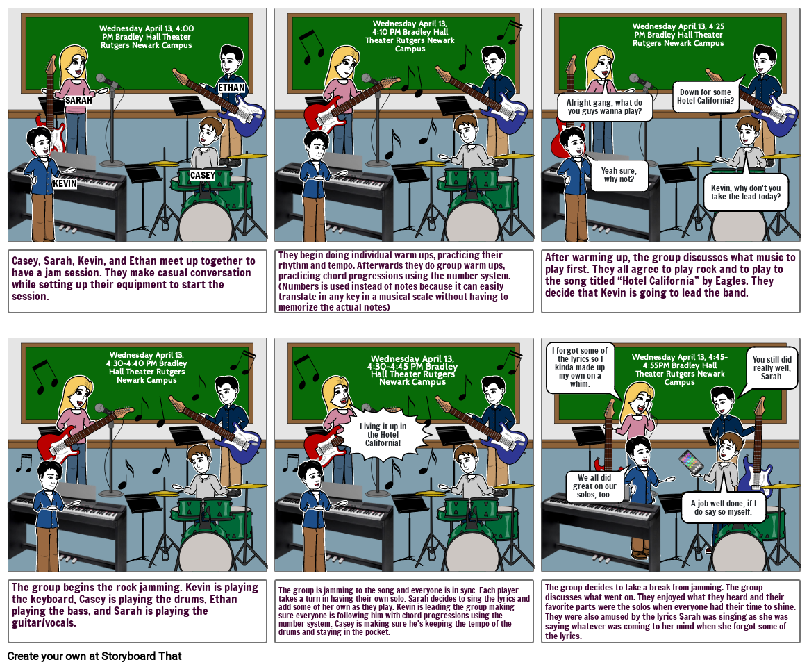 After warming up, the group discusses what music to play first. They all agree to play rock and to play to the song titled “Hotel California” by Eagles. They decide that Kevin is going to lead the band.