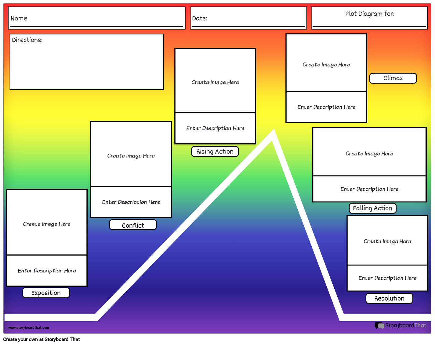 Работен лист с диаграма на парцел с тема на дъгата. Скицирайте и пишете за разрешаването, конфликта, нарастващото действие, кулминацията, падащото действие и разрешаването.