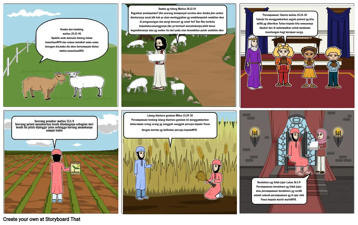 • Domba dan kambing matius 25:31-46Apabila anak manusia datang dalam kemuliaanNYA dan semua malaikat sama-sama denagan dia,maka dia akan bersemayam diatas takhta kemuliaanNYA