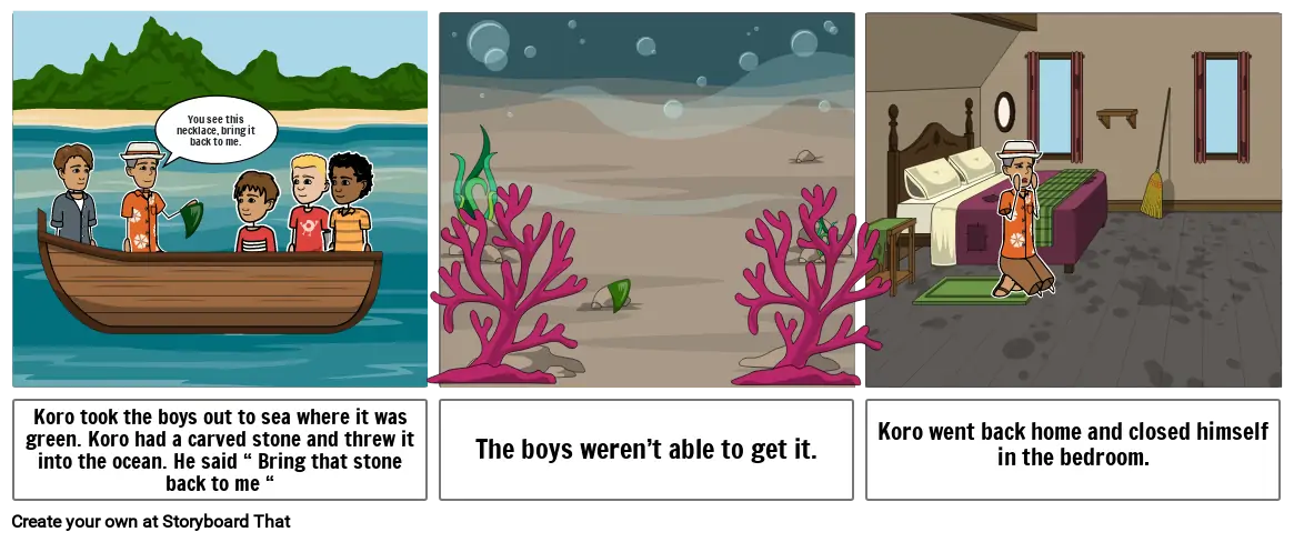 Koro took the boys out to sea where it was green. Koro had a carved stone and threw it into the ocean. He said “ Bring that stone back to me “