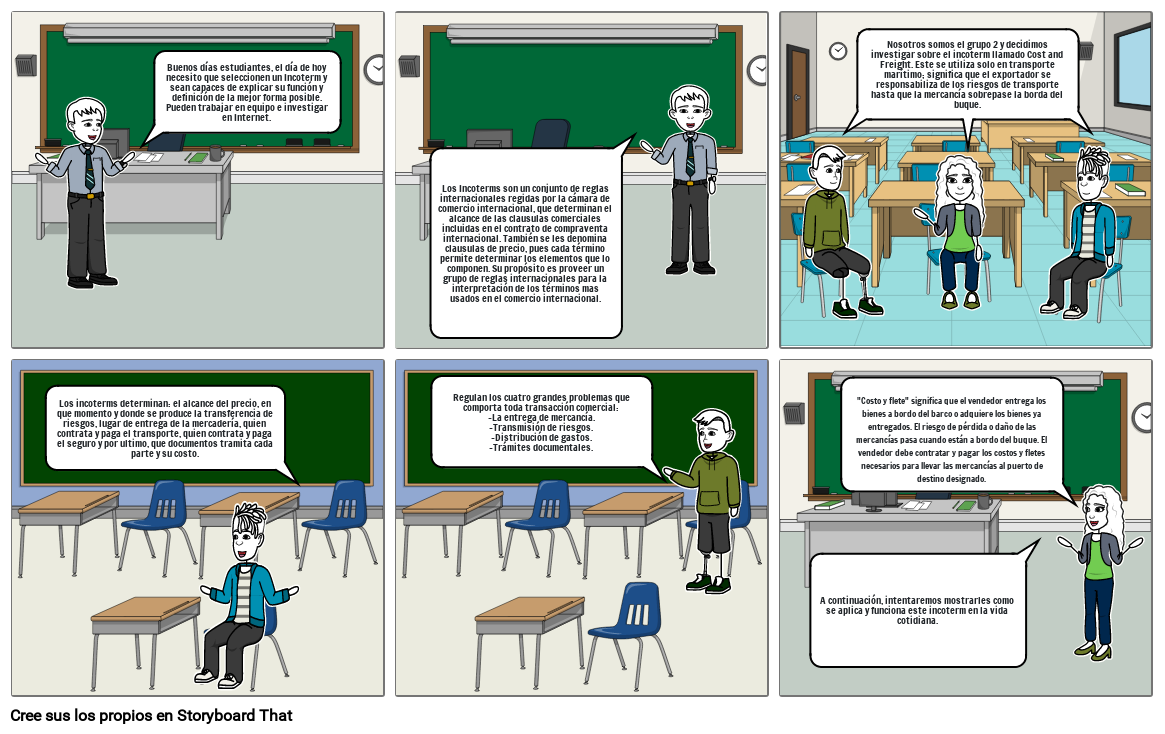 Nosotros somos el grupo 2 y decidimos investigar sobre el incoterm llamado Cost and Freight. Este se utiliza solo en transporte marítimo; significa que el exportador se responsabiliza de los riesgos de transporte hasta que la mercancía sobrepase la borda del buque.