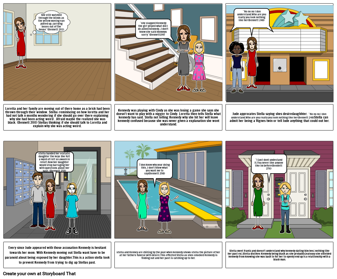 Jude approcates Stella saying shes desiredaughhter. ¨No no no I don understand.Who are you really you look nothing like her(Bennett 248)Stella can admit her being a Vignes twin or tell Jude anything that could out her.