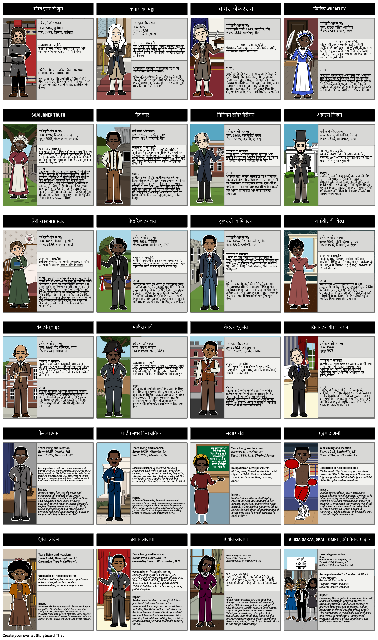 पूरी किताब में कई प्रभावशाली ऐतिहासिक हस्तियों का उल्लेख किया गया है, जिन पर मुहर लगी है: जातिवाद, आतंकवाद और आप। इस गतिविधि में, छात्र किताब में पढ़ी गई कुछ आकृतियों को नाम दे सकते हैं, एक चरित्र जोड़ सकते हैं जो उनके जैसा दिखता है और अमेरिका में नस्लवाद के इतिहास पर उनके व्यवसाय, उपलब्धियों और प्रभाव (चाहे सकारात्मक या नकारात्मक) के बारे में संक्षेप में लिखें। ।