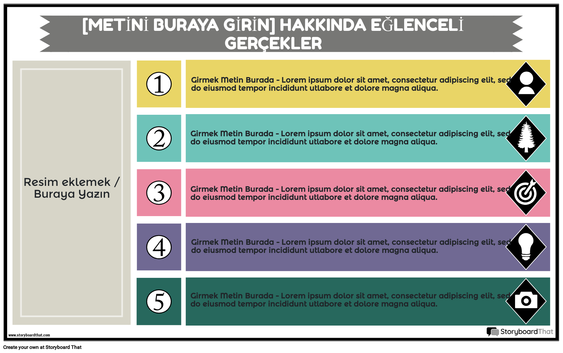 Bir konu veya ilgilenilen bir kişi hakkında eğlenceli gerçekler içeren renkli ve bilgilendirici bir infografik oluşturun! Öğrenciler veya öğretmenler, metin ve resimler ekleyerek bu infografik şablonu özelleştirebilir. Solda konuyu temsil etmek için bir karakter, öğe ve/veya sahnenin eklenebileceği büyük bir çerçeve vardır. Bu posterin çıktısı alınabilir ve sınıfta belirgin bir şekilde sergilenebilir veya dijital ortamda sergilenebilir.