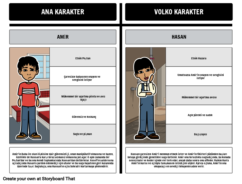 Amir'in Baba ile olan ilişkisine dair güvensizliği, onun manipülatif olmasına ve bazen, özellikle de Hassan'a karşı biraz acımasız olmasına yol açar. O aynı zamanda bir Peştun'dur ve bu onu kendi toplumlarında Hassan'dan üstün kılar. Assef'in saldırısına uğradığında Hasan'a yardım edemediği için utanır ve bu suçu hayatının geri kalanında üzerinde taşır. Suçluluğu, onu Hassan'ın oğlu Sohrab'ı kurtarmaya yönlendirir.